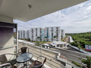 ✨ Balcón con vista a la piscina y zonas verdes, ideal para el descanso